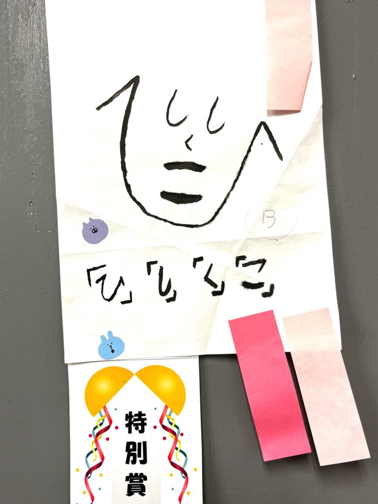 へのへのもへじセンス選手権 特別賞編 ホーム タグ: 書アート 選手権 2025-05-21 0 特別賞小学6年生 (Kくん) みなさんが投票して決定した ”金・銀・銅賞” を先日投稿させていただきました。 本日は、その他で光っていた作品を 「特別賞」 としてご紹介させていただきます。 実筆作品をリピートプリントして、色画用紙に貼ってみました。 こちらはブルーバージョン、下のはブラウンバージョンです。 こんなハンカチあったら、かわいいですね。 筆で書いた作品ですが、どこか海外の雰囲気が漂います。 作っている途中、サヴィニャックのチョコレート作品を思い出しました。 アートへのへのもへじ元住吉元住吉習字教室特別賞習字教室 コメントを残す コメントをキャンセルメールアドレスが公開されることはありません。 ※ が付いている欄は必須項目ですコメント ※ 名前 ※ メール ※ サイト 次回のコメントで使用するためブラウザーに自分の名前、メールアドレス、サイトを保存する。 投稿者 bimojimoji@gmail.com 関連投稿 タグ: その他 書アート はじめの一本 2026-01-10 0 「はじめの一本」と題して、 今の気持ちを一本... 1本今の気持ち墨画 すべて読む タグ: 書アート 書アート 金曜日クラス 2025-10-04 0 上 左から 「北」「羽」 下 左から 「子」... かぼちゃ書アート芸術の秋難しいから楽しい すべて読む タグ: 書アート 書アート 木曜日クラス 2025-10-02 0 上 左から 「見」「愛」 下 左から 「推」... 固形墨書アート芸術の秋 すべて読む タグ: 書アート 書アート 水曜日クラス 2025-10-01 0 続きまして水曜日クラスも、少しだけご紹介いた... かぼちゃ個性書アート漢字一文字芸術の秋 すべて読む タグ: 書アート 【芸術の秋】 書アートに挑戦! 2025-09-30 0 今年も 「芸術の秋」 を開催いたします。 今... たのしい時間元住吉習字教室書アート漢字一文字芸術の秋草間彌生 すべて読む タグ: 硬筆 選手権 速く、綺麗に書けるようになる!訓練 2025-05-30 0 3年生 1分50秒 (ほぼ同時) 6年生 ... お米大臣のスピード感学校のノートの字を変えていきたい早く綺麗に速筆 すべて読む 投稿ナビゲーション 前の投稿次の投稿